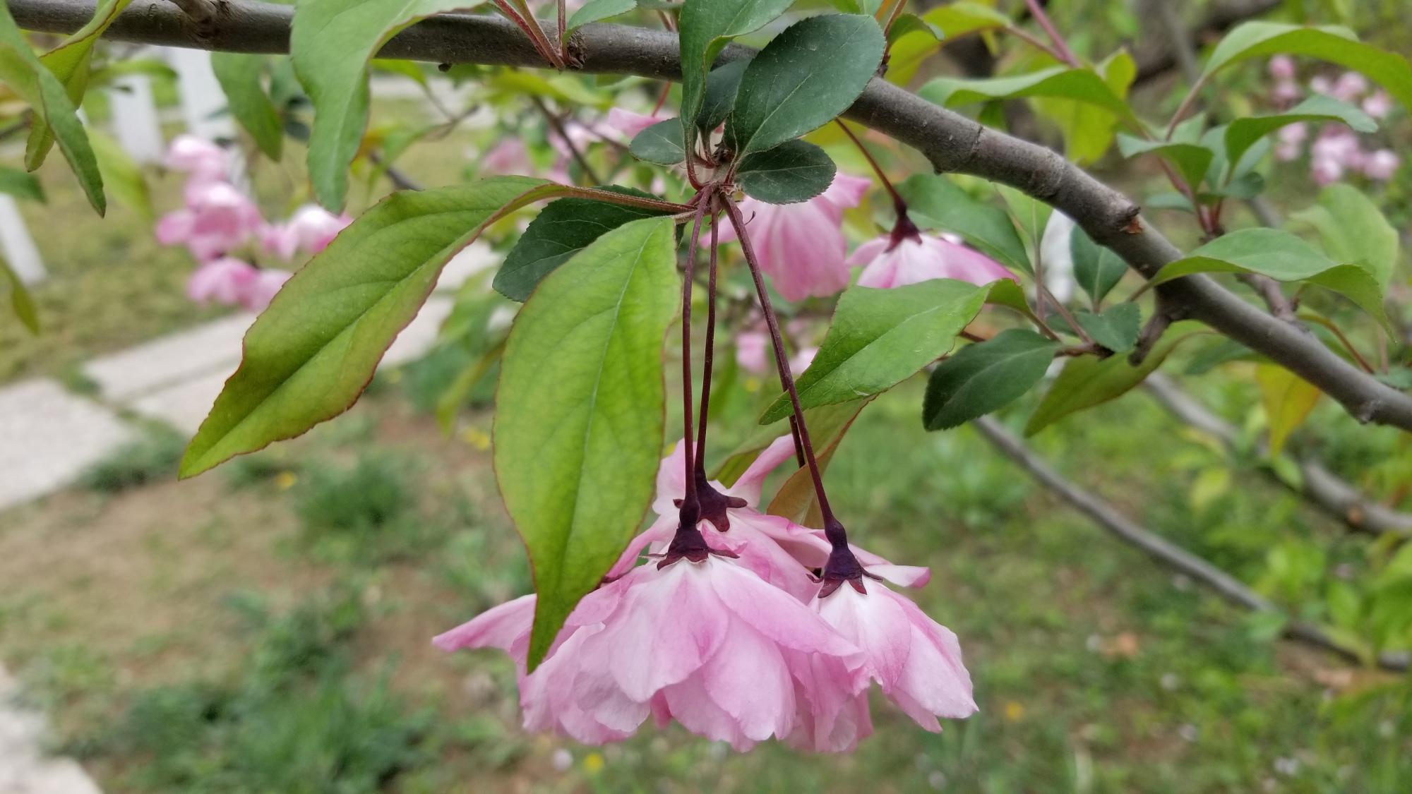 垂丝海棠花柄细长,紫色,光滑无毛,开花时花柄下垂生长。
