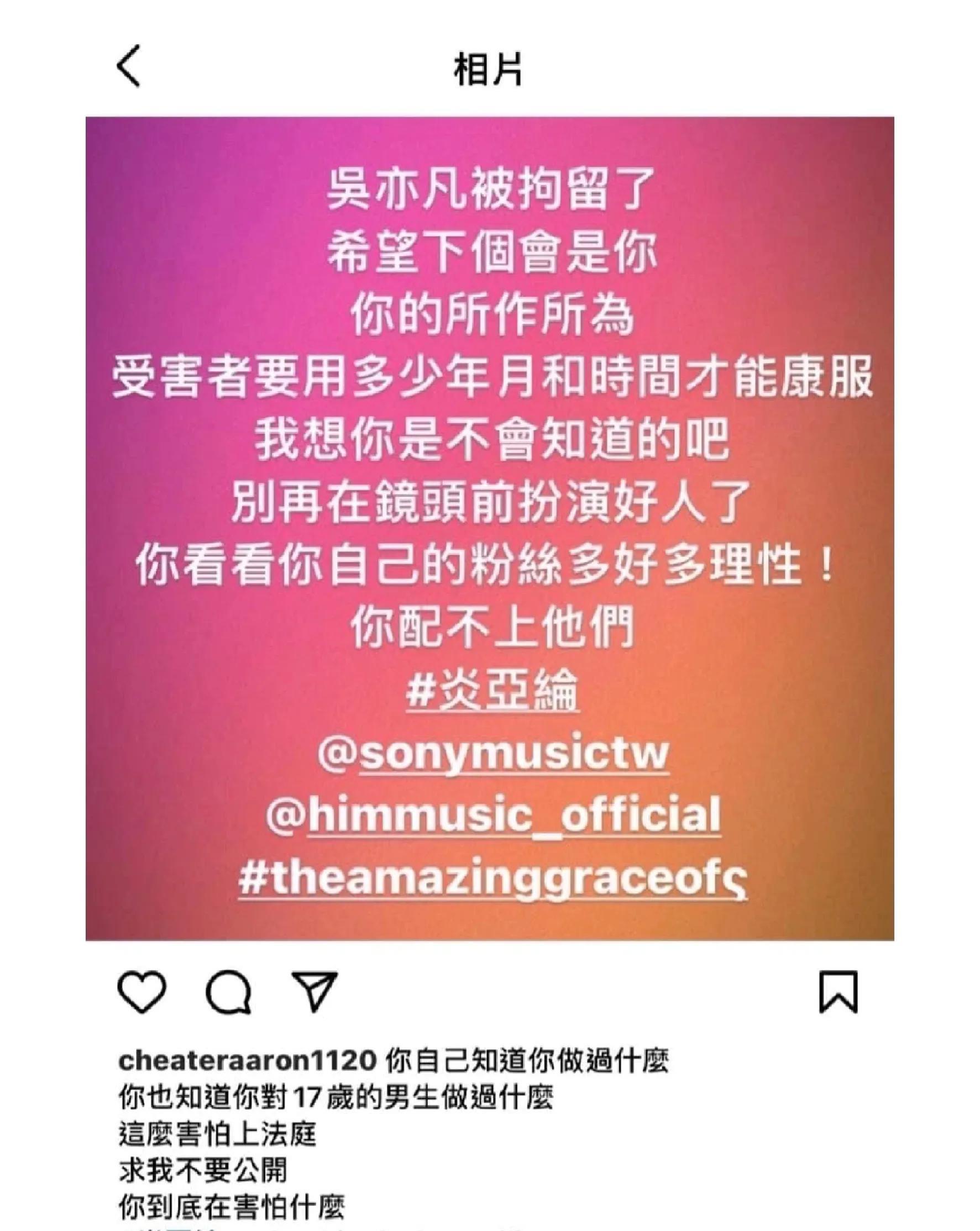 在此事件还未完结时,台湾省艺人炎亚纶又被前男友接连爆出黑料——性骚扰、与未成年人发生关系、偷拍私密视频外流、一次性劈腿三男、分手后扬言找黑道威胁,简直令人高呼辣眼睛。