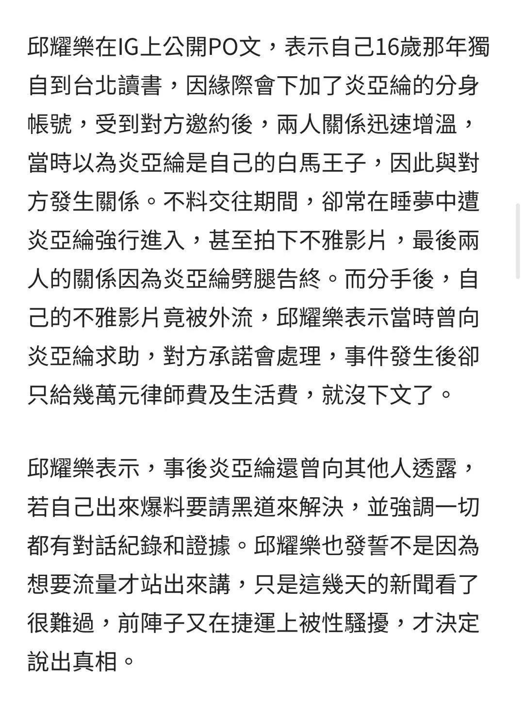 据当事人(邱耀乐)称,自己16岁时在社交平台因缘际会之下认识了炎亚纶,之后随着感情升温就发生了关系开始交往。不料在交往期间常在睡梦中被炎亚纶强行进入,还偷拍了视频,最后因为炎亚纶劈腿而分手。
