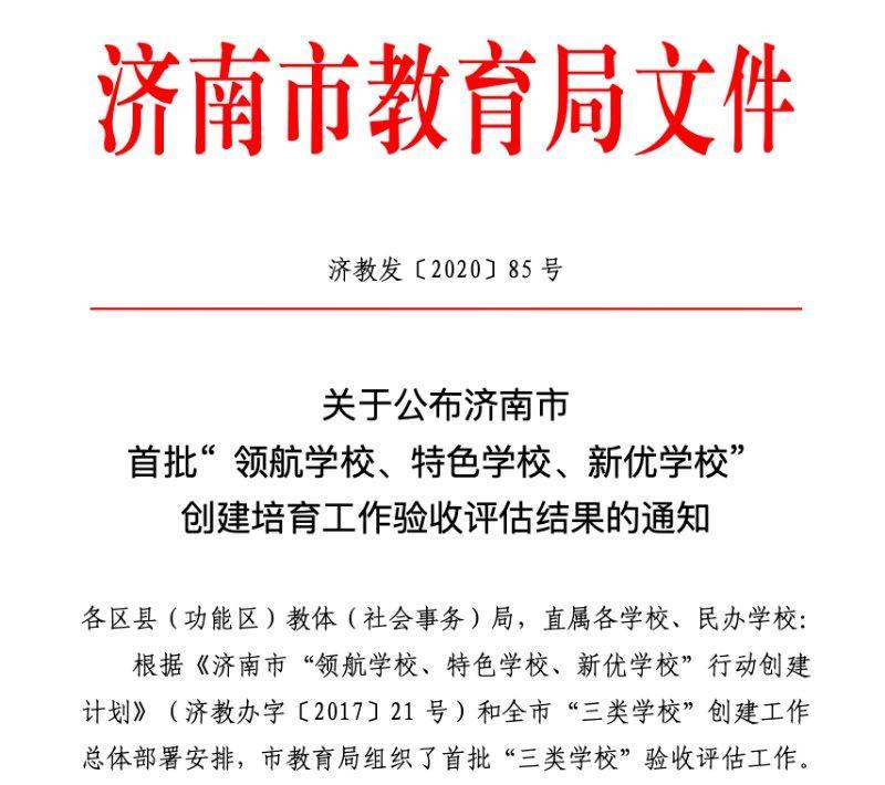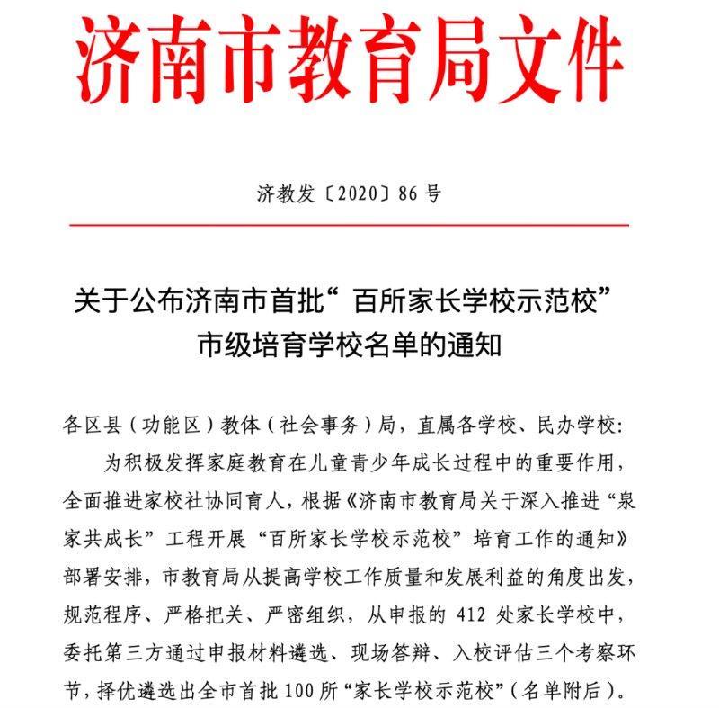 近日,济南市教育局公布首批“领航学校、特色学校、新优学校”三类学校验收评估工作结果。山大附中奥体中路学校荣获济南市首批“新优学校”及“百所家长学校示范校”市级培育学校称号。