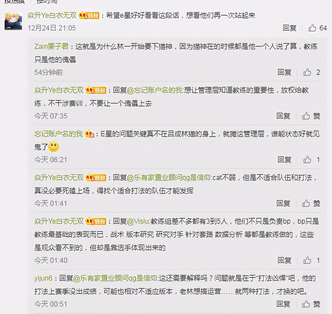 网友:e星不还是靠一个傀儡教练拿到了两个冠军?说明什么,谁的指挥,谁的bp,知道那五个人的实力了吧!estar不仅仅是教练问题了,e星整个俱乐部都有问题……希望t将军关了lpl后能好起来吧!