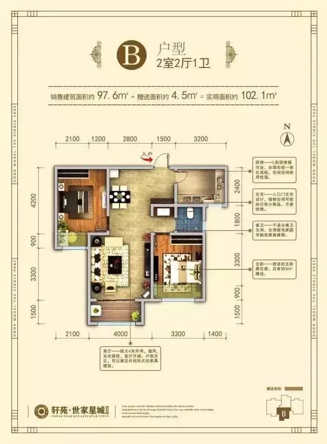 B户型建筑面积约97.6㎡,赠送面积约4.5㎡,舒适小两居。这个户型为全明户型。对于经济有一定压力的客户来说,是不二选择。主卧和客厅朝南,次卧是凹进去的,但可以算是朝南的户型。卫生间干湿分离、带上下水的阳台也在客厅,户型布局合理周正。