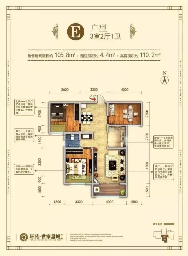 E户型建筑面积约105.8㎡,赠送面积约4.4㎡,这个户型可以说是B户型的升级版。户型整理布局类似,但更优于B户型。就是把两居室增加面积改为三居室,就是只有一个卫生间,需要衡量,同时两个卧室朝北,但窗户朝南。