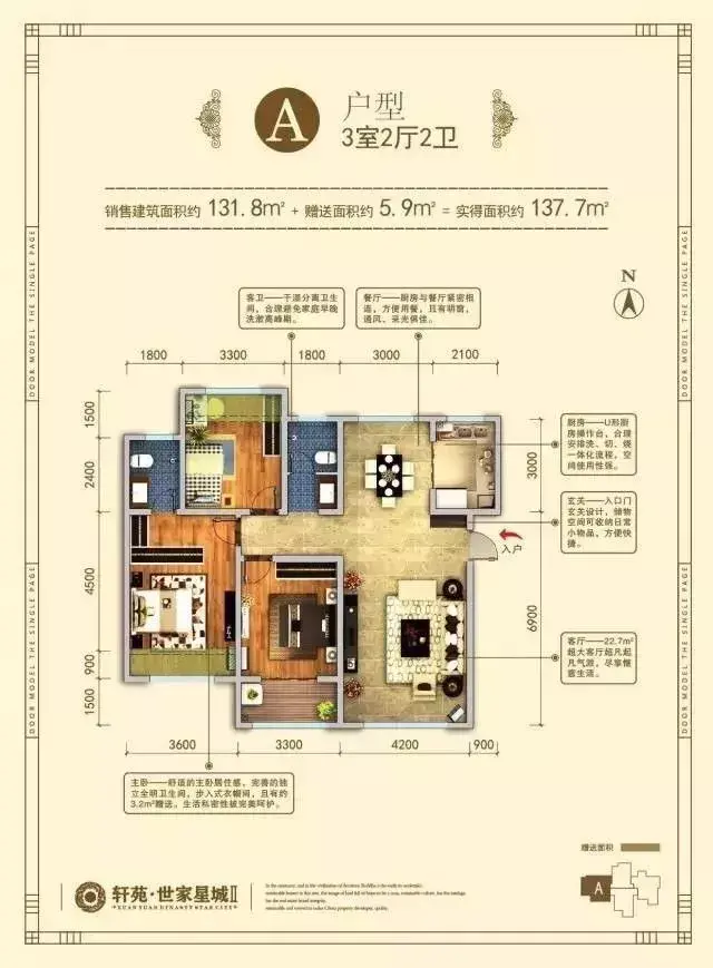 A户型建筑面积约131.8㎡,赠送面积约5.9㎡,舒适大三居。小编觉得这个户型格局是相对有优势的户型,主次卧都是南向,采光较好。主卧带小型衣帽间。客卫干湿分离,所有房间全明。唯一有缺憾的一点就是带上下水的阳台在次卧里面,有可能对日后生活造成一定不的不便。