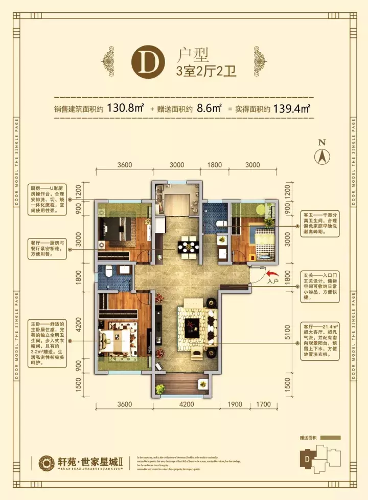 D户型建筑面积约130.8㎡,赠送面积约8.6㎡,是所有户型中赠送面积最大的户型。一个卧室朝南,两个卧室朝北,延续了上个户型的一点缺憾就是进门右手边是一个卧室。除此之外无其他弊端。主卧带衣帽间、带上下水的阳台在客厅、客卫干湿分离等亮点均具备。