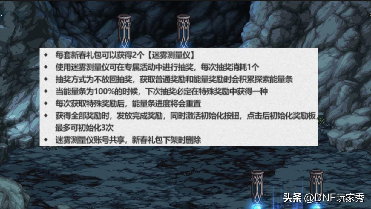 购买1套新春礼包,获得2个“迷雾测量仪”,可用于“不放回抽奖”,80%几率获得“10种普通奖励”,10%几率获得“4种能量奖励”,10%几率获得“6种特殊奖励”,抽奖累计能量100%,必定抽到“特殊奖励”。也就是说,拉满10套,可抽奖20次,可搬空奖池。