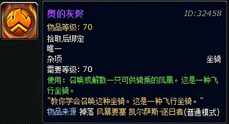 对于每个在艾泽拉斯大陆上征战的勇士来说,强大的装备当然是每个玩家的终极追求,当然,强大只是一时的,而华丽的外表则是永恒的,拉风的造型同样是勇士们追求的“梦中情人”。想必每个有玩过魔兽争霸的玩家都不会忘记人族有一个英雄叫做血法师,而他的大招是召唤一只会涅槃的凤凰,想必每一个勇士都希望拥有一支这样拉风的伙伴陪伴自己吧。而在魔兽世界怀旧服里,我们就有机会获得一只凤凰作为自己的坐骑,这个坐骑的名字就叫“奥的灰烬”。