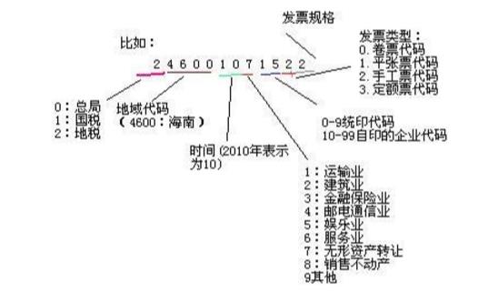 新版发票代码由国地税代码、行政区域代码、年份代码、行业代码、发票种类代码等组成,共12位。