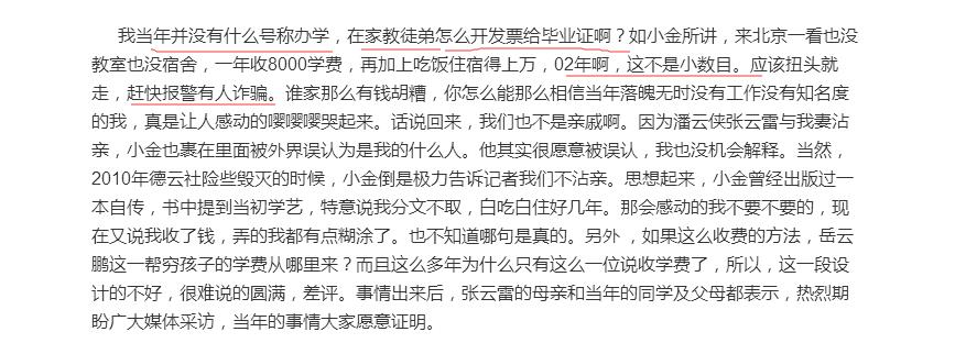 微博反驳了曹云金说其号称办学,一年学费8000是敲诈勒索的行为,郭德纲称自己并没有办学,只是在家教徒弟。