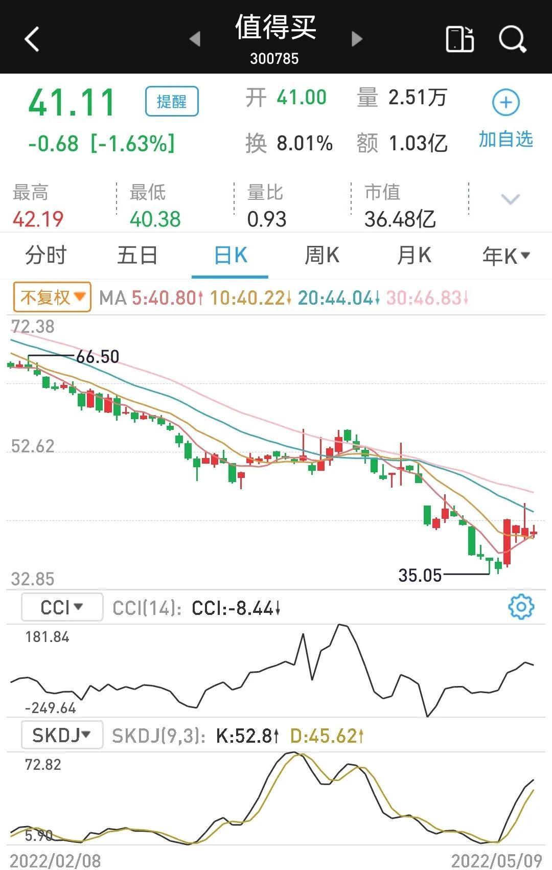 作为电子商务龙头的值得买(300785),在去年2月中旬创出216.40元后,开启了一波令人叹为观止的巨大跌幅。4月27日创出历史最低价35.05元。五一小长假前后,在电子商务疯涨带动下,该股4月29日一个20cm涨停板,将股价托山底部。虽然五一节后该股连跌3天,但是,有一个重要的信号告诉我们,它确实开始值得买了。