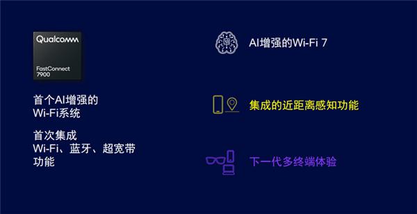 在骁龙 X80 之外,高通还推出了 FastConnect 7900 移动连接系统,预计将于 2024 年下半年商用,这是行业首个支持 AI 优化性能并在单个芯片中集成 Wi-Fi 7、蓝牙和超宽带技术的解决方案。