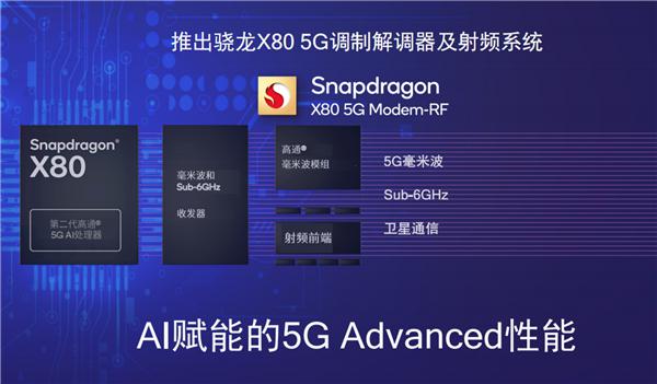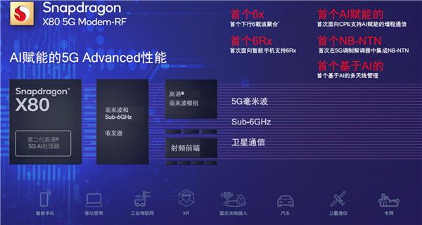 此外,骁龙 X80 还搭载了专用张量加速器,通过 AI 优化来提升吞吐量、服务质量(QoS)、频谱效率、能效和毫米波波束管理,扩大网络覆盖范围并降低时延。