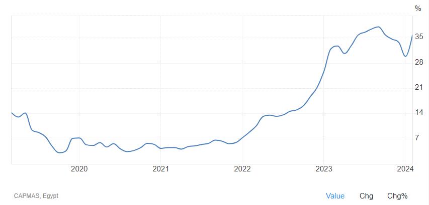 近年来,埃及经历着严重的通胀危机。当地时间 3 月 10 日,埃及中央公众动员与统计局公布的数据显示,埃及年度城市消费者通胀率也出现显著上升,从 1 月的 29.8% 升至 2 月的 35.7%。通胀率上升的主要原因是重点行业价格的上涨。其中,肉类和家禽价格上涨 25.0%,谷物和面包上涨 14.2%,鱼类和海鲜上涨 11.5%,鸡蛋和奶酪等乳制品上涨 12.8%,而食品和饮料价格同比涨幅则达到了 50.9%。