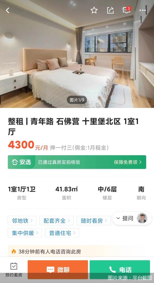 对于孙岩的反馈,北京商报记者陪同孙岩在该平台上搜索北京租房信息,选中了一套位于将台地铁站附近的一居室。从平台内发布的信息和照片来看,该房源面积约 60 平方米,房屋干净整洁,室内装修也颇为精致,租金 4200 元一个月。" 图片就是实拍,房间装修一模一样。" 线上沟通环节,该房源中介给出肯定的答案。然而当记者和孙岩线下看房时,中介果然告诉记者和孙岩线上那套房子 " 恰巧 " 被租出去了,要带看位于周边小区的另一套同等品质房源。