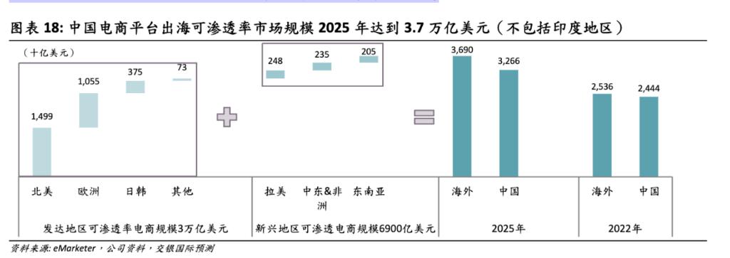 在海外市场中,新兴地区如拉美、中东及东南亚等地线下商业布局及物流体系搭建相对落后,是中国电商出海企业重点布局地区,估算合计可渗透市场约 6900 亿美元;发达地区虽然基础设施完善,但市场空间大,合计可达 3 万亿美元规模,也是中国电商出海的目标地区。