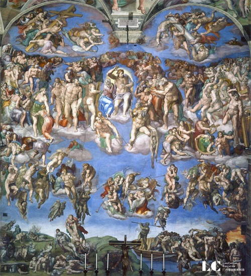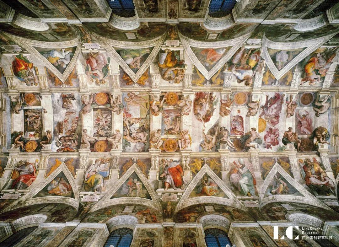 也许是在教廷神学家的帮助之下,米开朗琪罗设计了一组气势磅礴的壁画:中间9幅用于表现《创世纪》中的故事,从上帝创世到人类的堕落,再从大洪水到人类通过诺亚一家获得重生;在这些场景周围他创造了一些建筑式的框架结构,其底部画着12位坐在宏伟宝座上的先知,而在穹顶的网格和弧形空间里则画着耶稣的祖先。教堂四角的穹隅里描绘的是以色列人民奇迹般获得拯救的故事。这项浩大的工程仅仅花了4年(1508-1512年)就全部完成,也让米开朗琪罗成为了一位空前绝后的伟大艺术家。1999年12月,人们对西斯廷教堂天顶进行清扫和修复工作时发现米开朗基罗作品的颜色仍然异常地鲜亮和丰富1535年,新任教皇保罗三世(1534-1549年在位)再次将米开朗琪罗召至西斯廷教堂,要求他在祭坛后的墙壁上画一幅《最后的审判》4以替代15世纪佩鲁吉诺创作的圣母升天祭坛画以及摩西和耶稣生平故事的前两个场景。