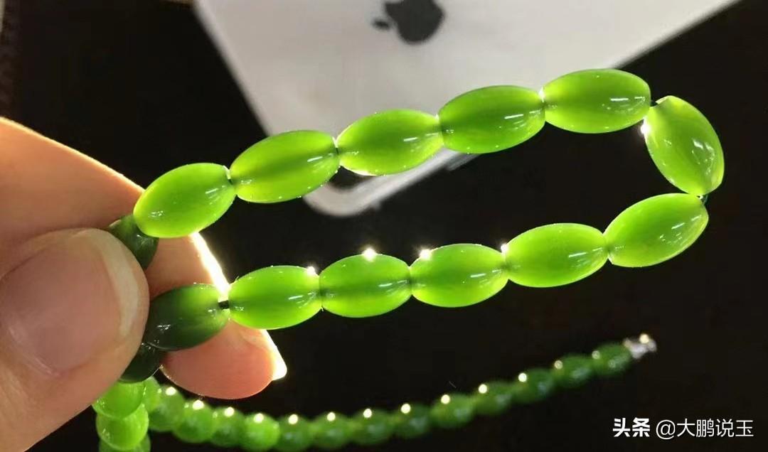 和田碧玉的主要成分也是透闪石,内含阳起石、蛇纹岩等,所以它的硬度和晶体排列都和其他种类和田玉是一样的。不同的是含有主要致色元素铬与镍,导致它的色调呈现绿色,打灯后处于半透光或者微透光状态。
