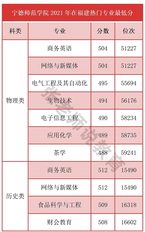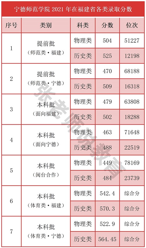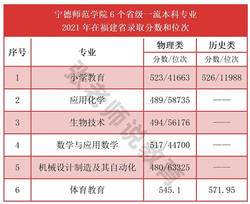 特别说明:宁德师范学院2021年分专业录取分数、高考“3+1+2”模式选科要求和具体招生信息请到宁德师范学院官网查询和了解。