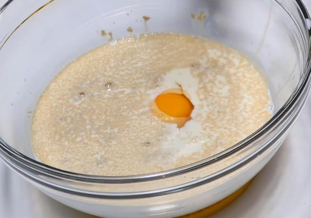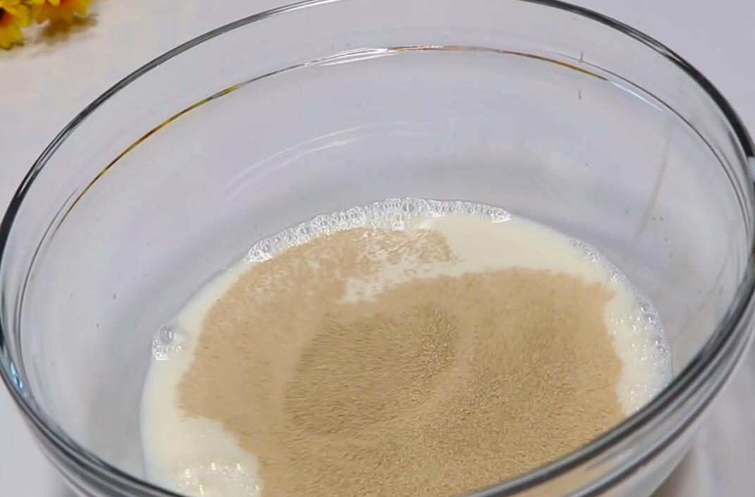 2:牛奶白糖汁倒入酵母粉6g,记得倒入后要搅拌均匀,防止后面倒入鸡蛋不好搅拌