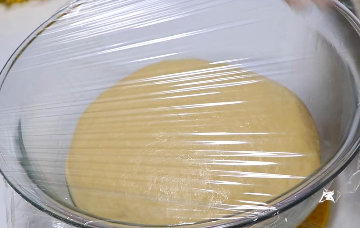 6:盖保鲜膜,醒面30分钟,等面团发到2倍大面团状,揪开一个口,里面成蜂窝状就是发好了面团,用手压一下,面团成泡发状