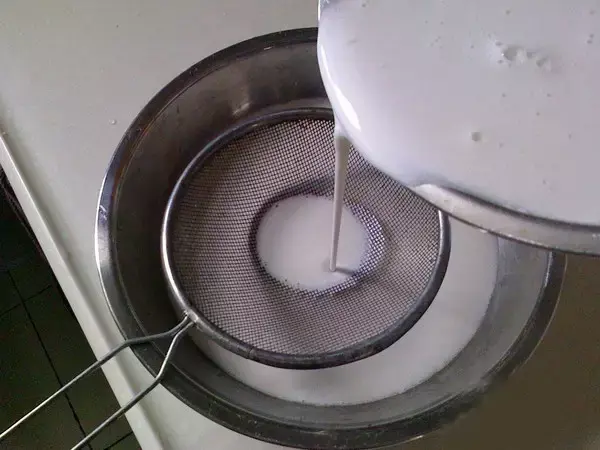 3、打好的米浆倒入大碗里,加入2克食盐和40克的淀粉搅拌至无颗粒的米糊