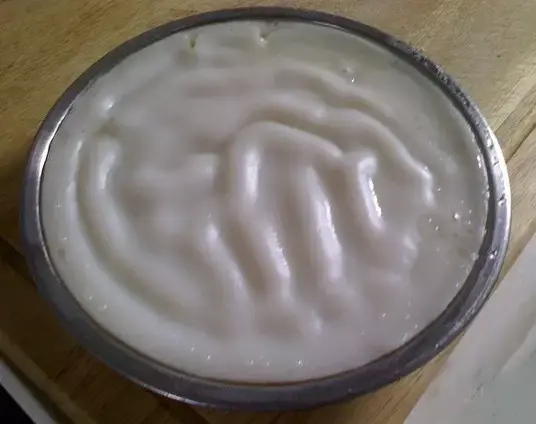 5、取一不锈钢盘,待蒸锅上汽后把盘子放入空蒸3分钟,然后在盘底扫一层花生油再把米糊倒入(米糊分三次倒入)