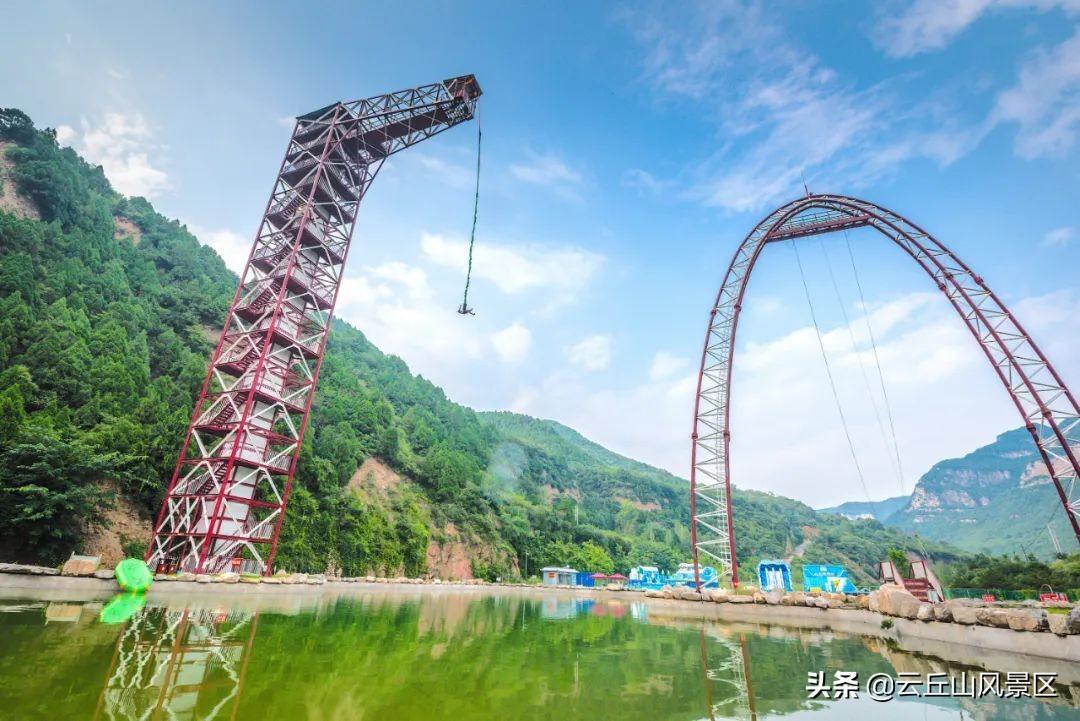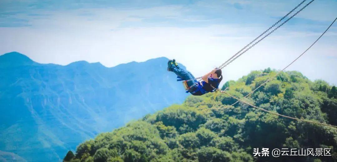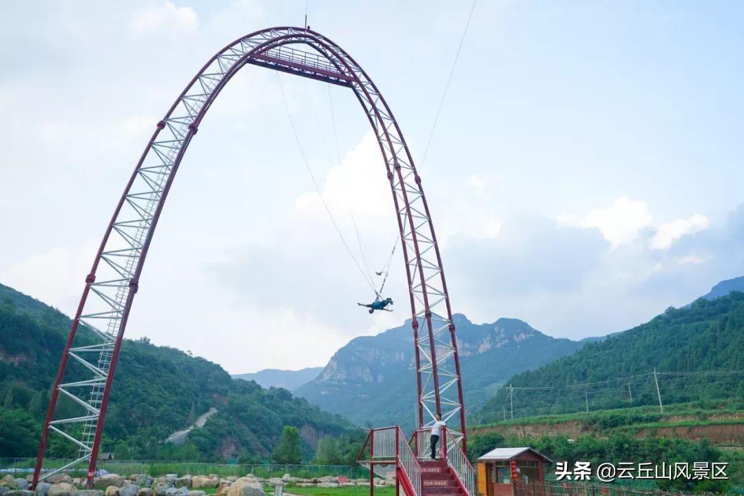 来云丘山挑战山西第一高!从地面至最高点的总高度为46米,挑战者从41米的跳台一跃而下,只需3秒的时间、就可以以时速50公里急速跃下,xiuxiuxiu~