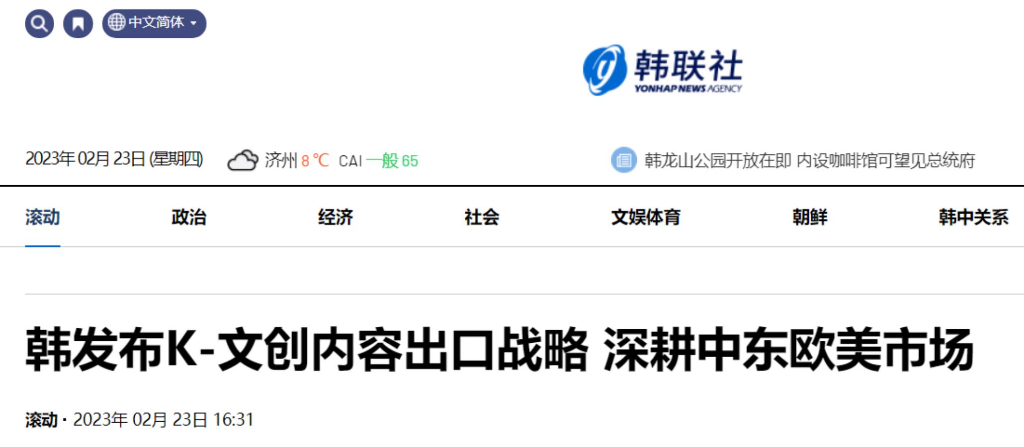 在韩国媒体这篇报道里面,韩国官方将韩流定义为“K-文创出口战略”,表示韩流在中国这样的海外市场已经获得巨大的成功,接下来将以此作为基础,全力将韩流文化推广到中东和欧洲、北美市场。