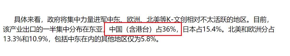 从红圈处可以看到:韩国官方表示,目前韩流出口已经拿下东亚地区,其中最大市场就在中国,高达36%的份额,比第二名的日本多出了一倍。