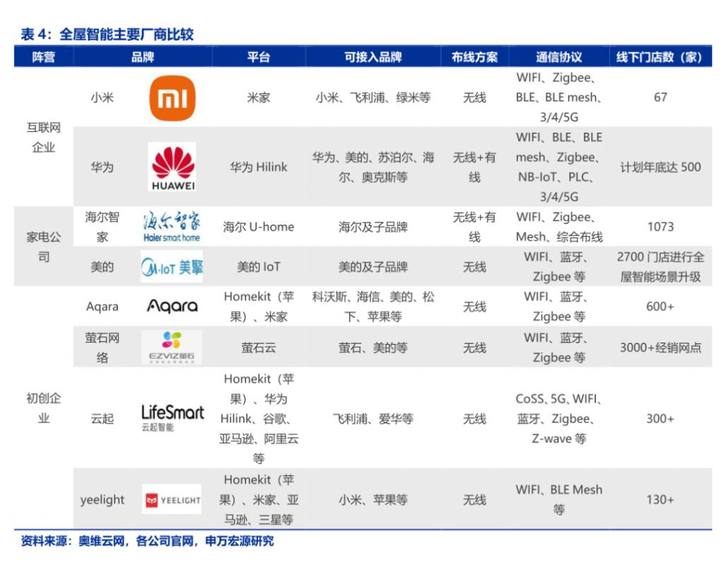 资源整合型服务商中控屏出货量强势,手机厂型则是手机家居手机 APP 端口月活强势,白电厂也公布自己的智能家电销量来显示其强势地位,大家似乎在全屋智能生态都有目标客户和光明的未来。