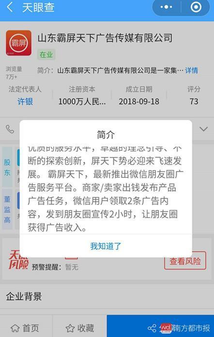 11月底,山东当地媒体调查发现,与霸屏天下项目有关的公司是两家:山东天下物联信息技术有限公司、山东霸屏天下广告传媒有限公司。南都记者曾经报道,山东天下物联信息技术有限公司成立于2018年1月,地址位于山东临沂市,公开渠道找不到该公司联系方式。