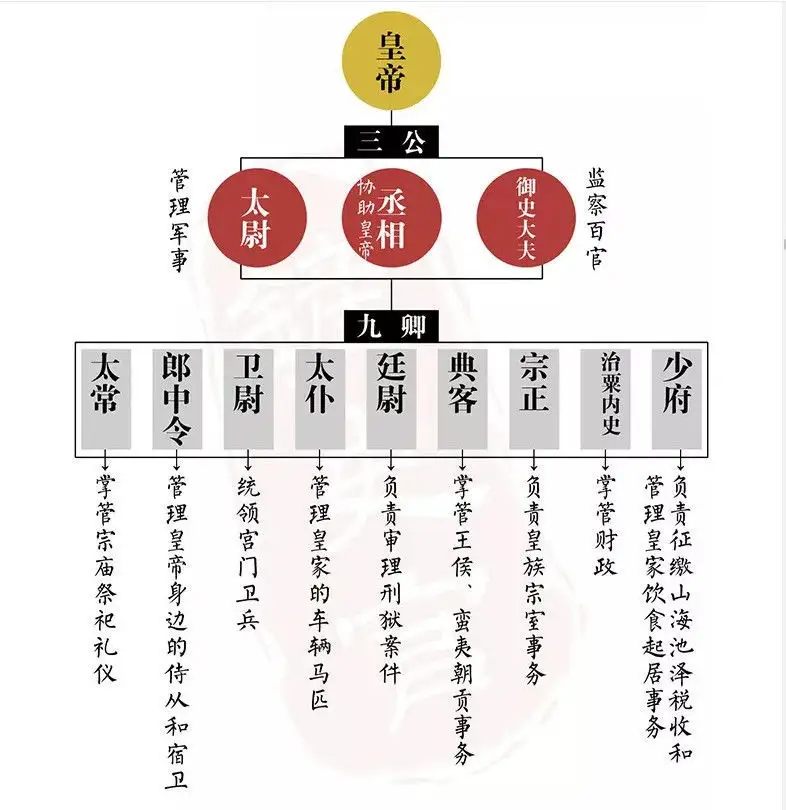 在秦始皇称帝之后的中国古代制度中,一开始中央朝廷主要是三公,也就是丞相、御史大夫、太尉三公,丞相负责行政,御史大夫负责监督百官和辅佐丞相,太尉负责军事。后来加入九卿,不过九卿中除了少数官职外,大多数都是为皇帝本人服务,通常为国家服务的外朝官员主要是指三公尤其是丞相管辖的官员,而丞相一个人肯定无法独自治理国家,就开始设立各曹辅佐丞相。