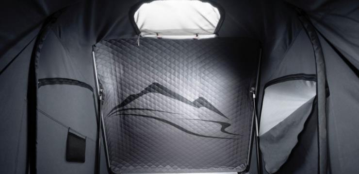 除此之外,该款车顶露营帐篷还搭载一套机械式气压系统,车主可以通过该系统简易快速地对帐篷进行展开与收纳,同时还配备折叠梯,以方便人员上下进出;与此同时,帐篷内部还配有触感舒适的高密度泡棉床垫,以及专为潮湿天气所设计的防水拉链和防雨罩,并且帐篷两侧还配有通风窗,既做到了通风又阻止了蚊虫进入,同时还可以有效地阻隔外界光线。
