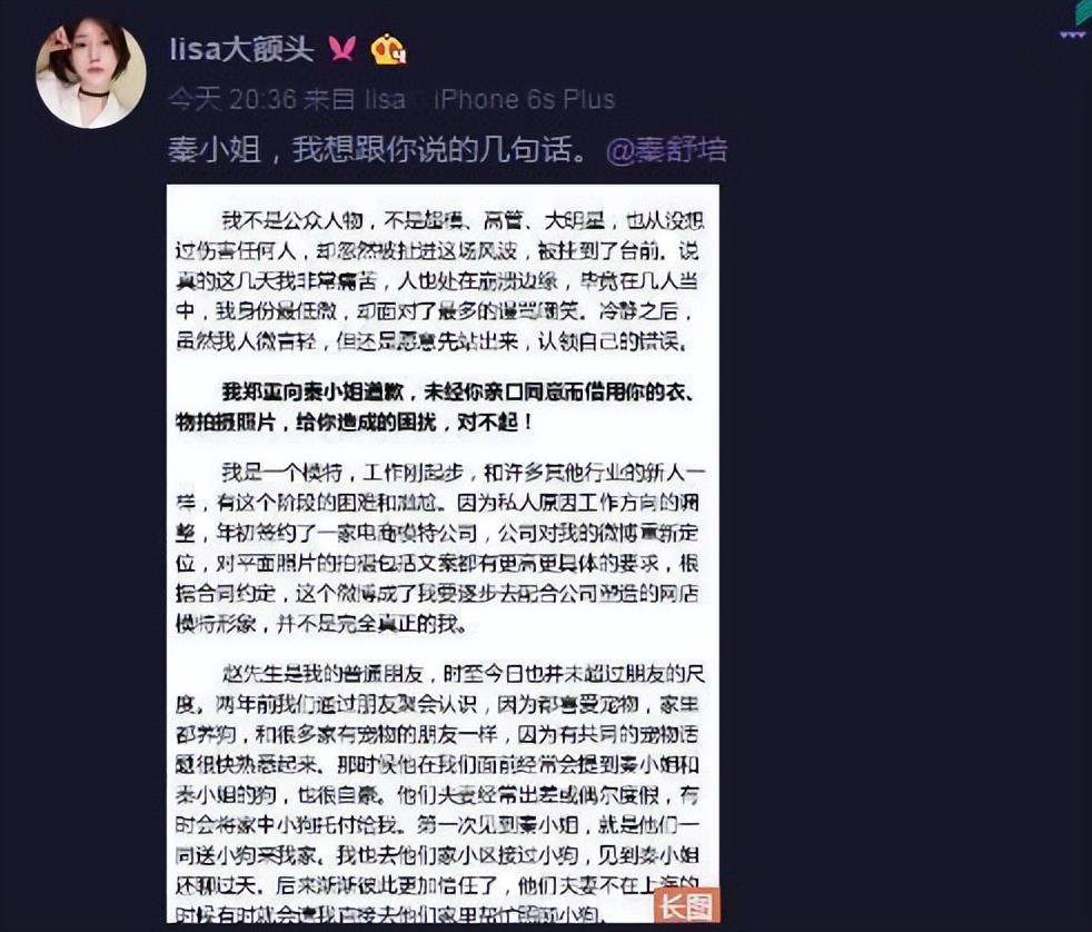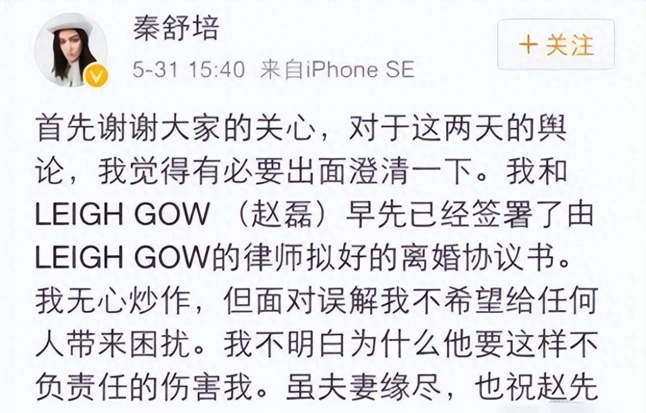 秦舒培在社交账号上表示,是对方出轨在线,并且连小三都给扒了出来,喊话赵磊“在发声明前先让你的女友把我的衣服包包脱下来”!并且在最后加了一句证实在去年就已经协议离婚。