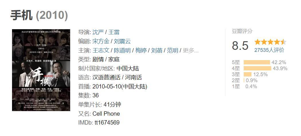 《手机》豆瓣评分8.5分,是由沈严、王雷执导,王志文、陈道明、梅婷、刘蓓、柯蓝等主演的都市剧,该剧于2010年5月10日在中国大陆上映。