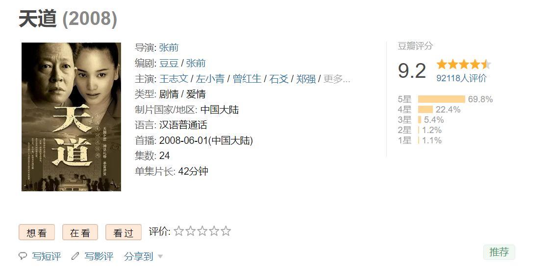 《天道》豆瓣评分9.2分,是由张前执导,王志文、左小青、曾红生及石爻领衔主演的商战剧,该剧于2008年11月16日在中国大陆上映。