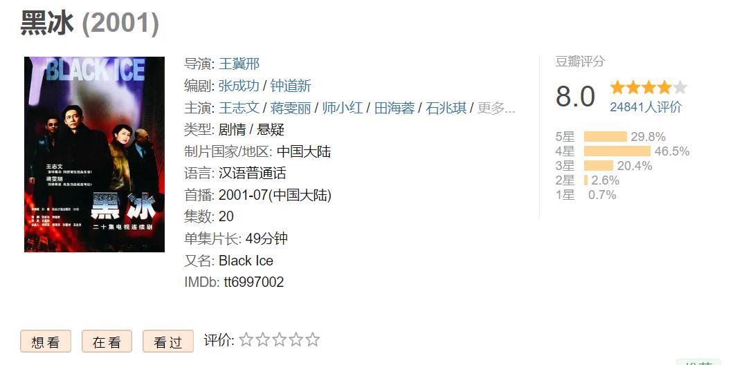 《黑冰》豆瓣评分8.0分,是由王冀邢执导,张成功编剧, 王志文、蒋雯丽、田海蓉、师小红等主演的一部悬疑剧,该剧于2001年07月在中国大陆上映。