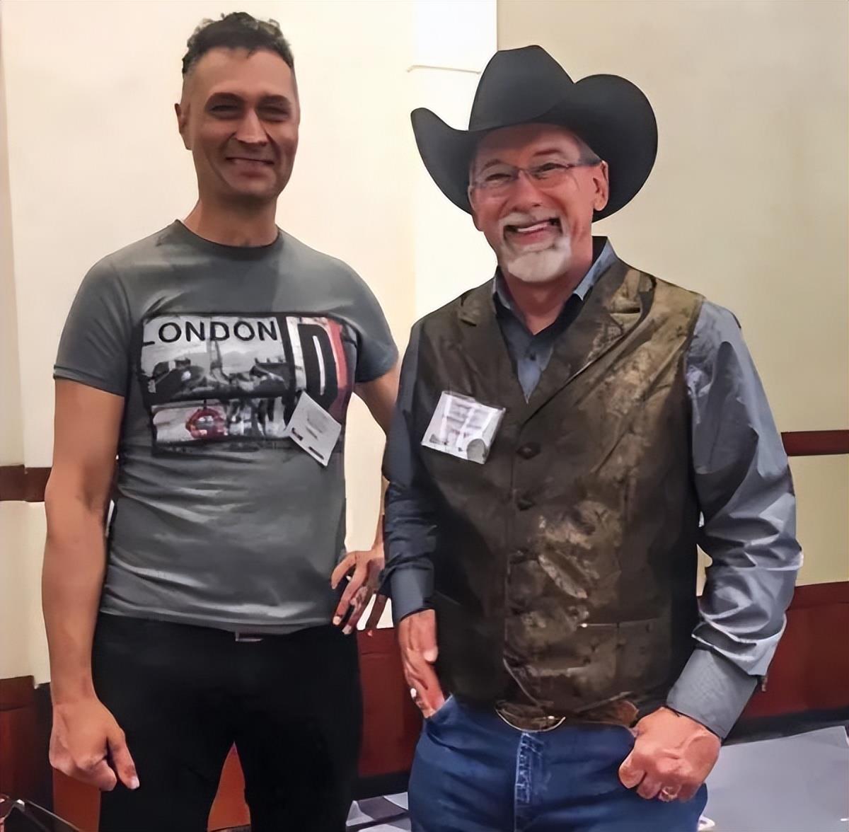 杰森(左)和FIF评委道格·马尔凯达在2018 SHOT Show期间,在温克勒展台上展示了“好基友”的形象。