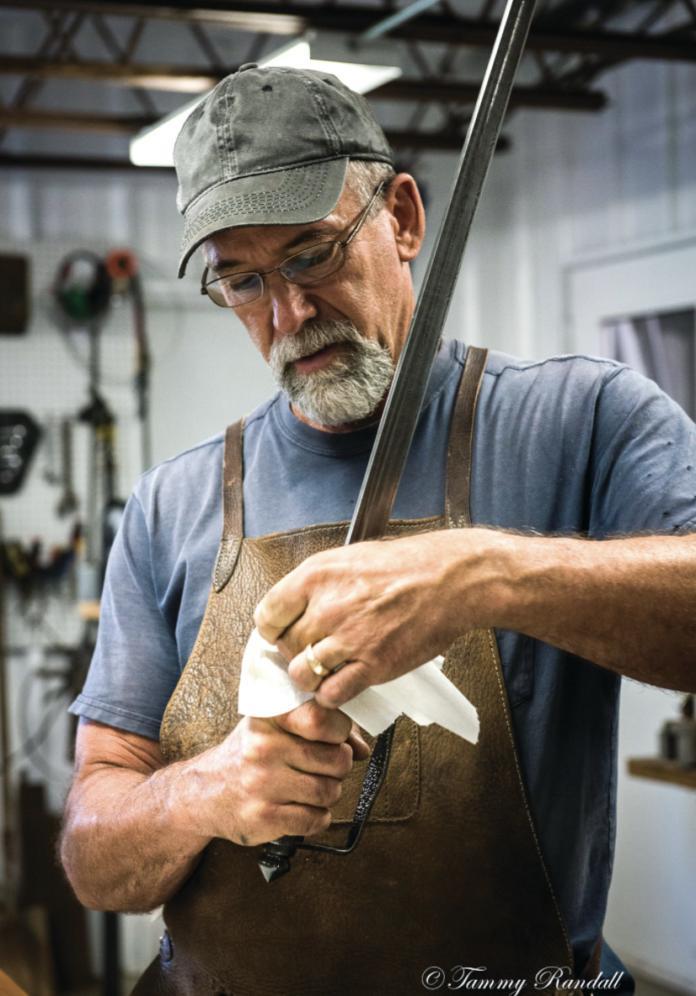 兰德尔在他的铁匠铺擦拭斯帕德龙剑。谈到FIF时说:“这使公众对手工制作的东西有了了解,这是一件好事。”