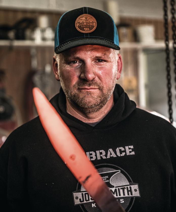 乔什·史密斯(Josh Smith)在他的工作室注视着正在锻打的钢坯。