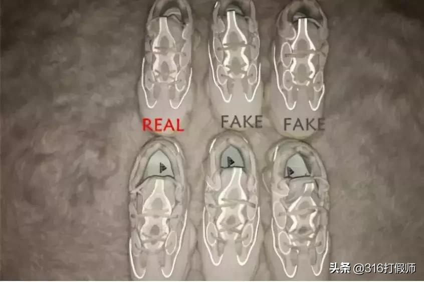 REAL鞋底显得比较黄,FAKE鞋底淡一点,左一为真,右边两双为假。