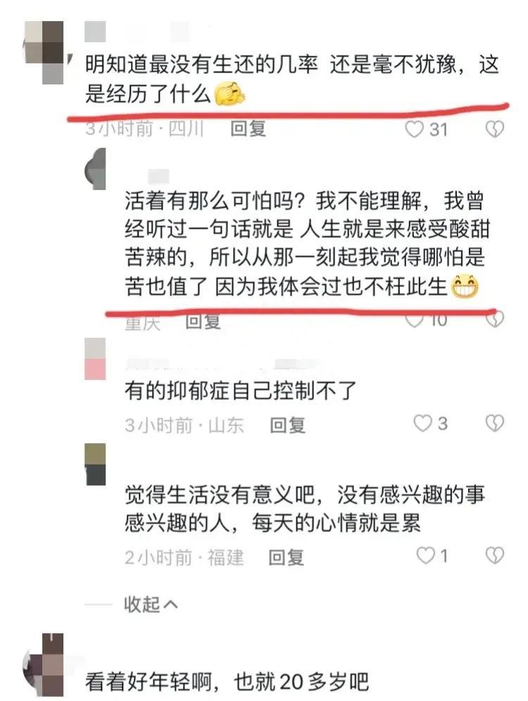 还有网友感慨道,活着有那么可怕吗?我不能理解,我曾经听过一句话,人生来就是感受酸甜苦辣的,所以从那一刻起,我觉得哪怕是苦也值了,因为我体会过不枉此生。