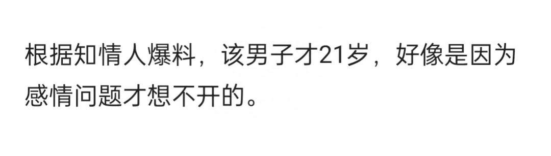 据知情人爆料,该名男子21岁,是一名大学生,平时特别乖巧孝顺,因为感情问题,一时想不开自杀。