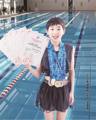 今年1月,她代表绍兴市游泳队,参加本届浙江省青少年游泳锦标赛。在400米自由泳中仅与第二名0.59秒之差惊险斩获金牌,同时还获得了另外2银2铜的好成绩。