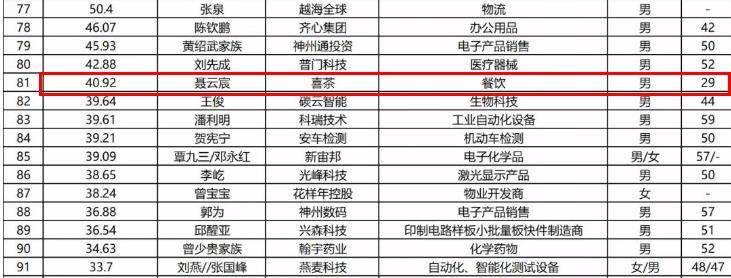 8月27日新财富公开了深圳创富百人榜名单,马化腾以3970亿身家排名第一,紧随其后的是恒大许家印以及顺丰王卫,这些都是老生常谈,其中最受关注、最有话题热度的是排名81的喜茶创始人聂云宸,29岁的他身家已有40亿!