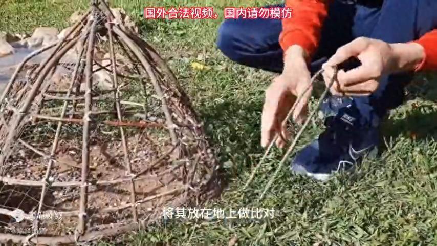 这个国外小伙大摇大摆地走到了这块空阔的地带,手里提着用树枝提前制作好的捕鸟笼子,将其放在地上做比对。