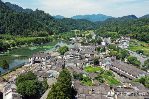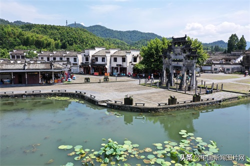 7月16日,安徽黟县西递古村落。西递,位于安徽省南部,距黄山风景区仅41公里。建于北宋皇祐年间,村落平面呈船形,占地16公顷。2000年列入世界文化遗产的安徽黟县西递村,近年来依托写生游、研学游助力乡村振兴,打造了一座画里乡村。(无人机照片) 中新社记者 韩苏原 摄