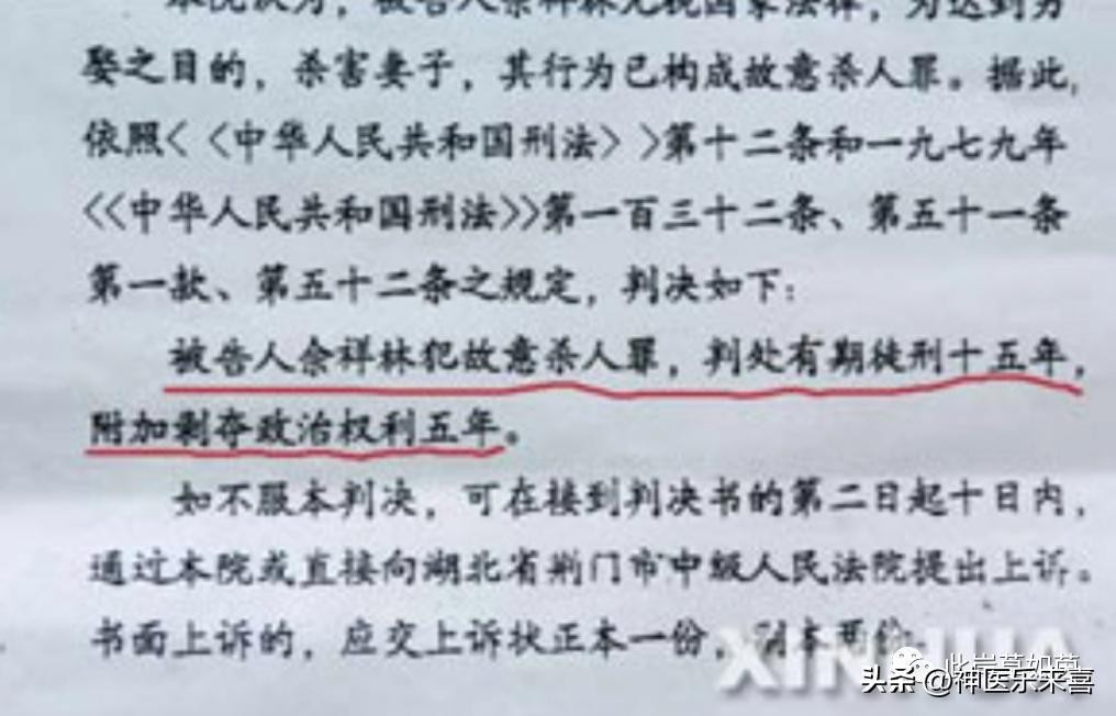 1998年6月15日,京山县法院以故意杀人罪判处佘祥林有期徒刑15年,剥夺政治权利5年。