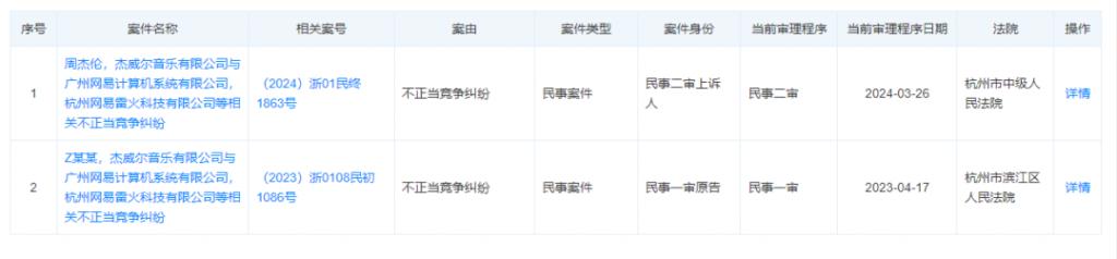 天眼查 APP 显示,广州网易计算机系统有限公司等与杰威尔音乐有限公司的不正当竞争纠纷案件将于 3 月 26 日二审开庭,上诉人为周杰伦、杰威尔音乐有限公司。