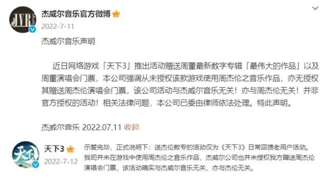 去年 4 月 17 日,杰威尔以不正当竞争为由将网易告上法庭,起因是 2022 年时网易在推广旗下游戏《天下 3》时,曾将周杰伦新专辑的元素制作成游戏道具,并在新浪微博官方账号内举办转发抽奖送周杰伦新数字专辑及演唱会门票的活动。
